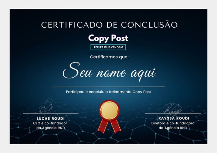 Ao concluir o Treinamento você terá acesso imediato ao Certificado de conclusão Exclusivo , personalizado e assinado pela equipe responsável da Agência Roudi Negócios Digitais.